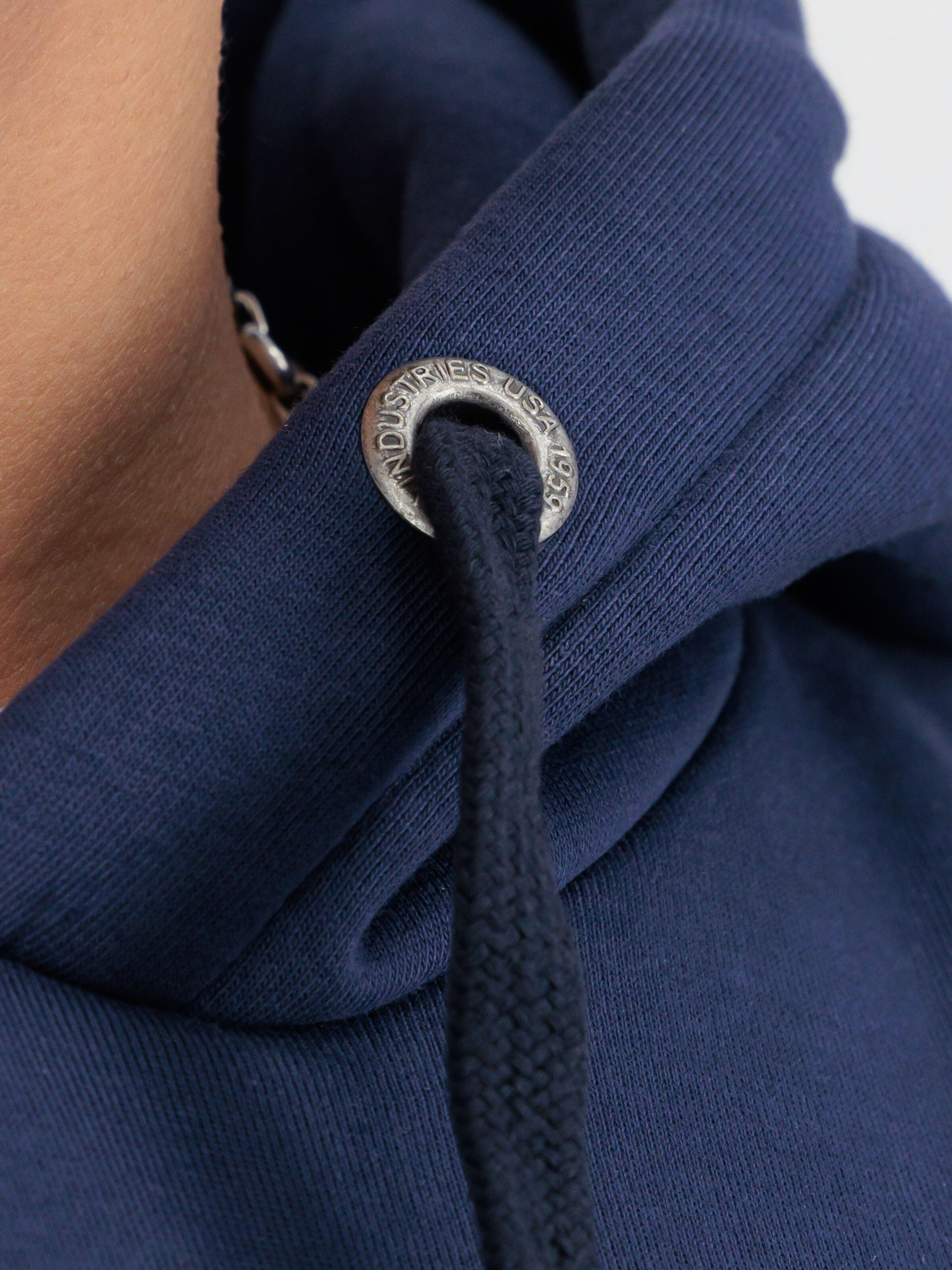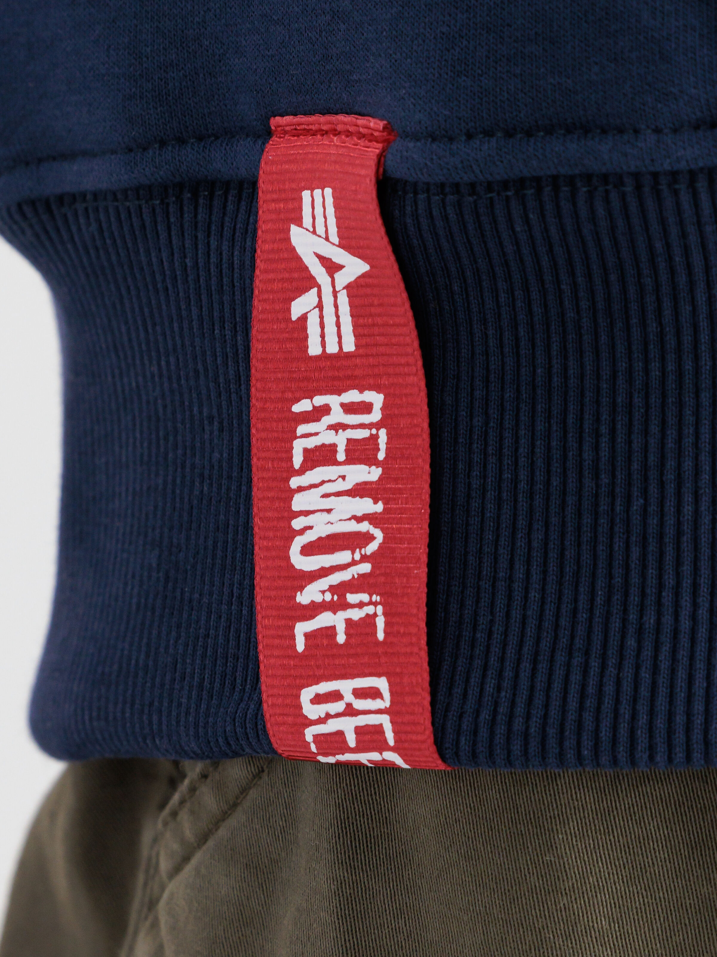À l'intérieur du col se trouve un ruban "RBF" (Remove Before Flight), clin d’œil à l'historique aérospatial d’Alpha Industries. Un autre label "RBF" est également présent au niveau du bas du sweatshirt, apportant ainsi une signature unique au vêtement.